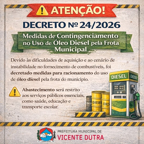A Prefeitura de Vicente Dutra, no RS, publicou, na última sexta-feira, 20, decreto que institui o contingenciamento do uso de óleo diesel na frota de veículos e máquinas do município.