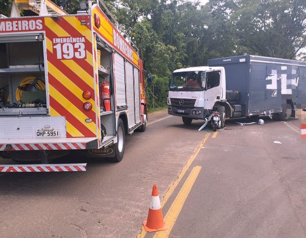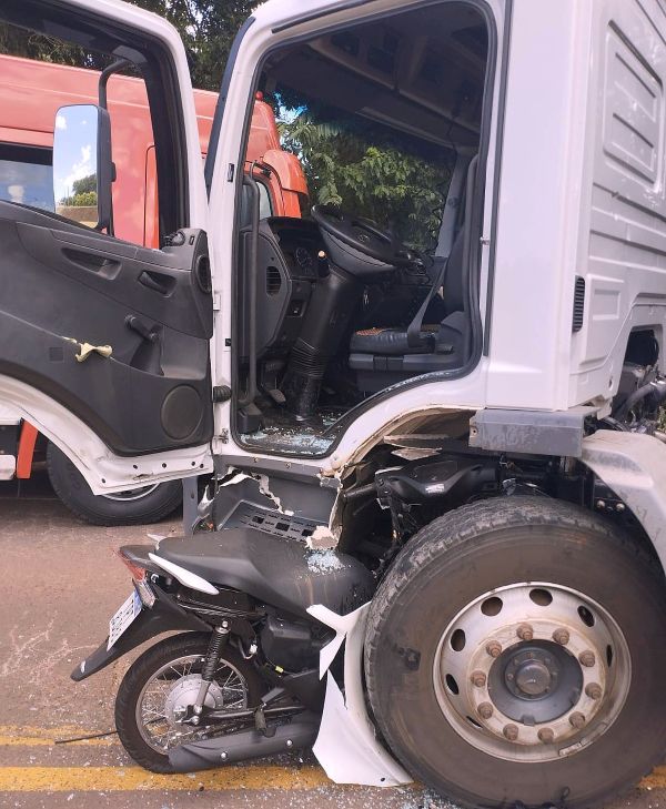 No local, foi confirmada a colisão entre uma motocicleta Honda Biz e um caminhão Mercedes-Benz.