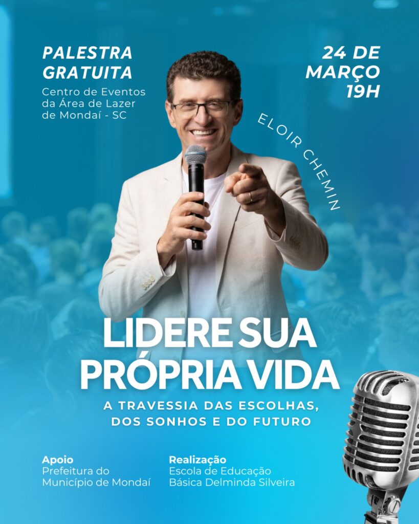 Será realizada no dia 24 de março, às 19 horas, no Centro de Eventos da Área de Lazer de Mondaí, a palestra gratuita “Lidere Sua Própria Vida – A travessia das escolhas, dos sonhos e do futuro”, com o palestrante Eloir Chemin, o qual é Coch, empresário, e analista comportamental.