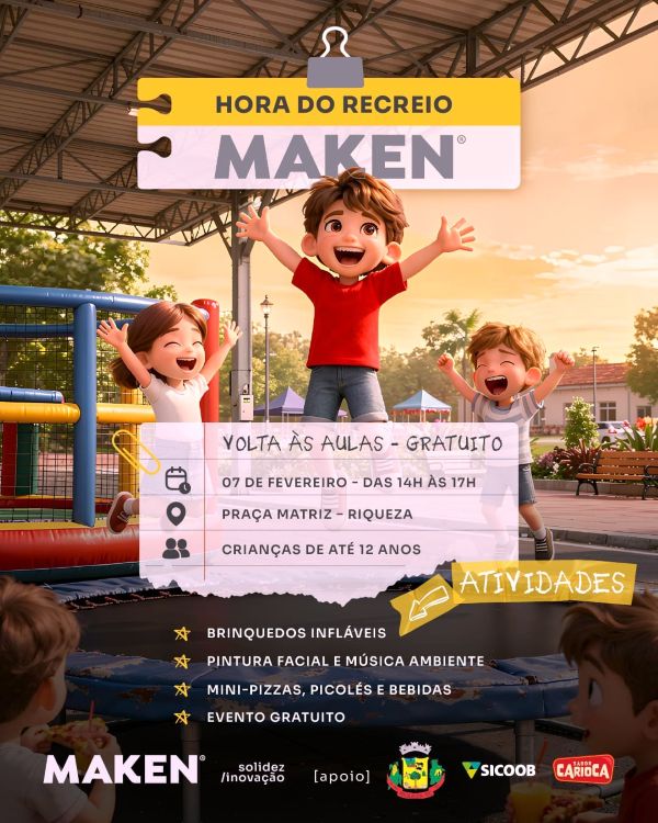 O projeto ‘Hora do Recreio’, que terá sua primeira edição neste final de semana, promete uma tarde especial de diversão para crianças de 0 a 12 anos do município de Riqueza e da região.